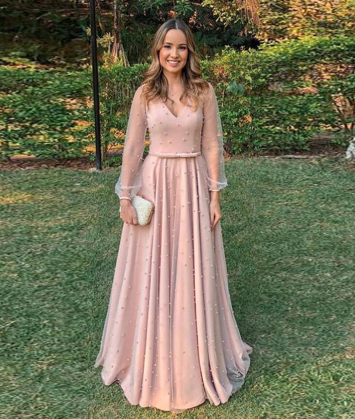 A Line V Neck Blush Pink Long Sleeve Prom Dresses