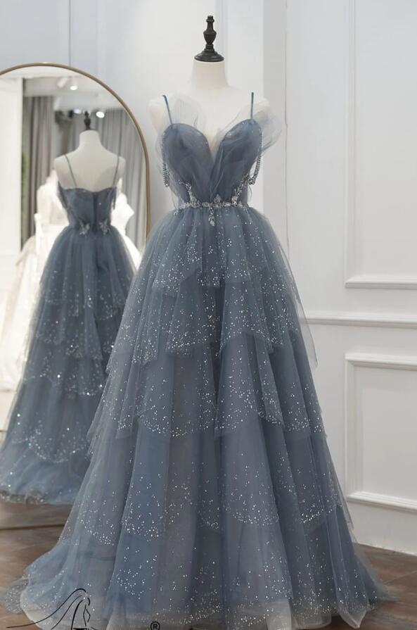 A-Line Dusty Blue Long Formal Prom Dress With Beaded