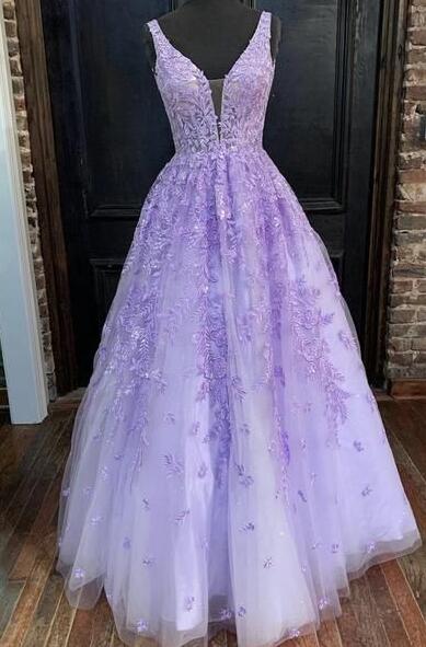 A Line V Neck Purple Lace Long Prom Dresses
