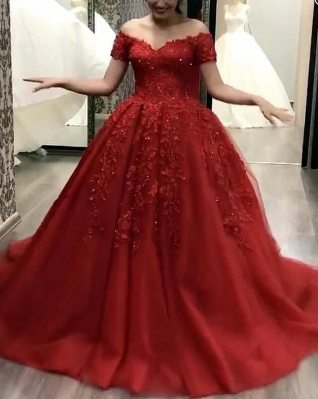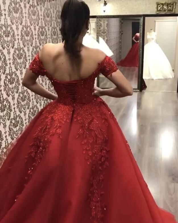 Off the Shoulder Red Ball Gown Lace Prom Dresses