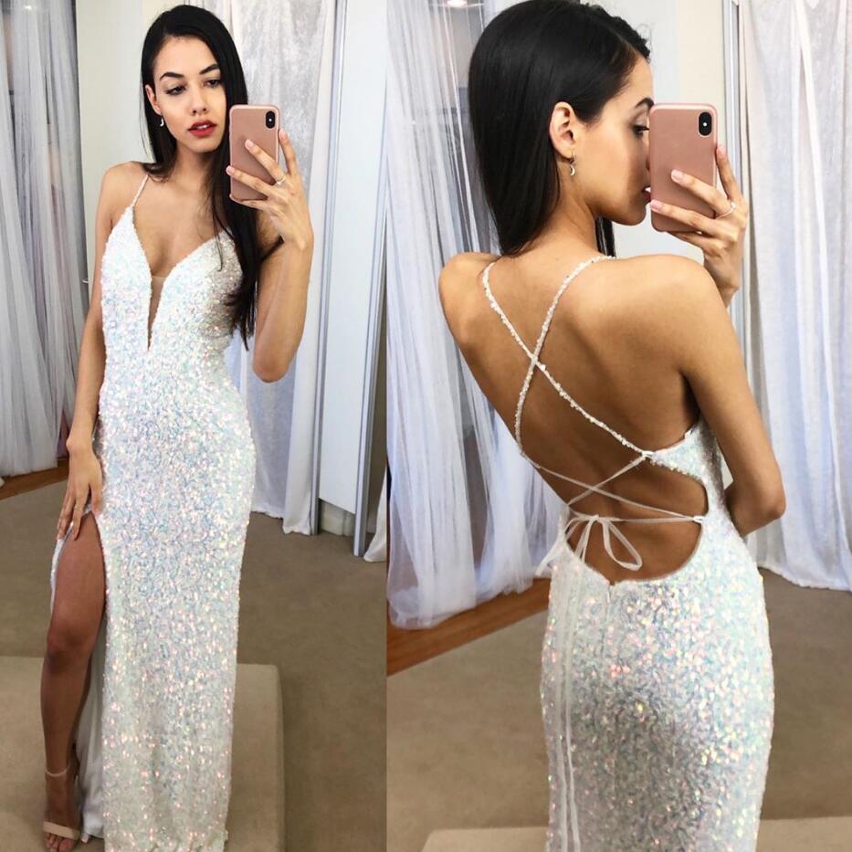 Sexy V Neck Cross Back White Sequin Prom Dresses
