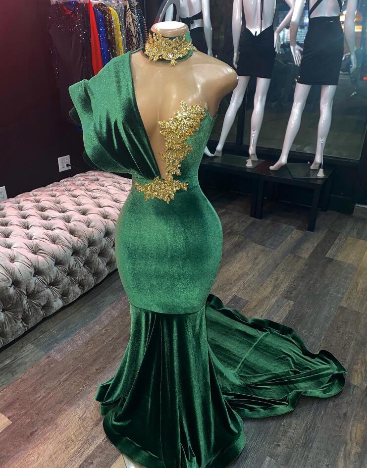 Mermaid Green Velvet Evening Dress With Gold Lace