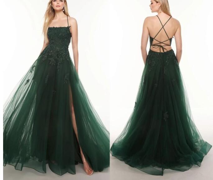 Spaghetti Straps Dark Green Lace Appliqued Tulle Prom Dresses