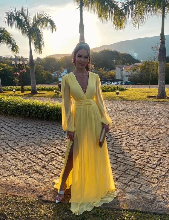 Elegant A Line V Neck Yellow Chiffon Prom Dress With Long Sleeves