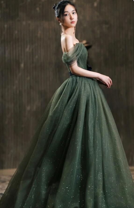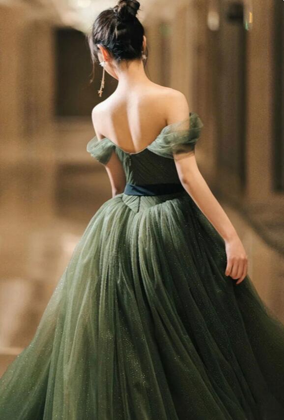 A Line Off Shoulder Green Tulle Long Prom Dresses