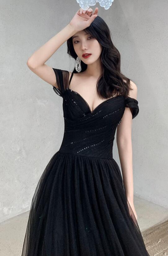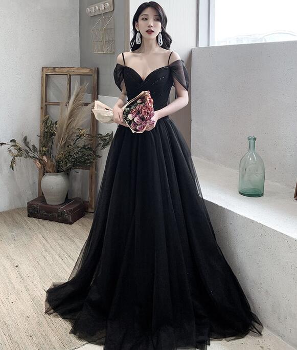 A Line Off Shoulder Black V-Neck Tulle Prom Dresses