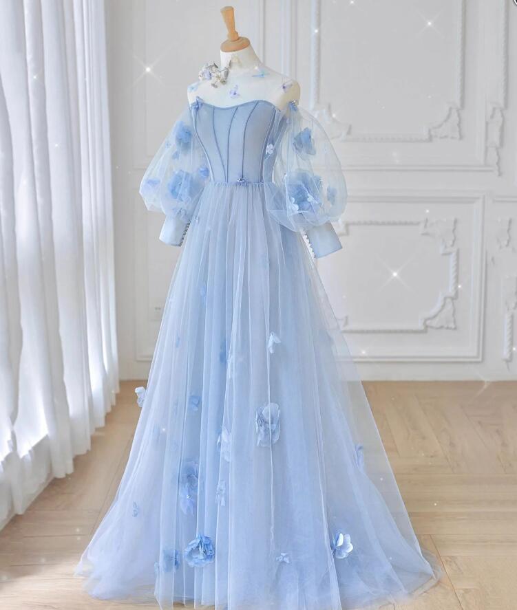 A Line Blue Tulle Prom Dress With Long Sleeves