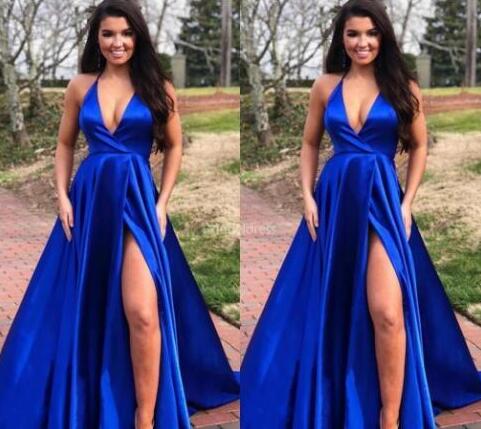 A Line Deep V Neck Royal Blue Prom Dresses