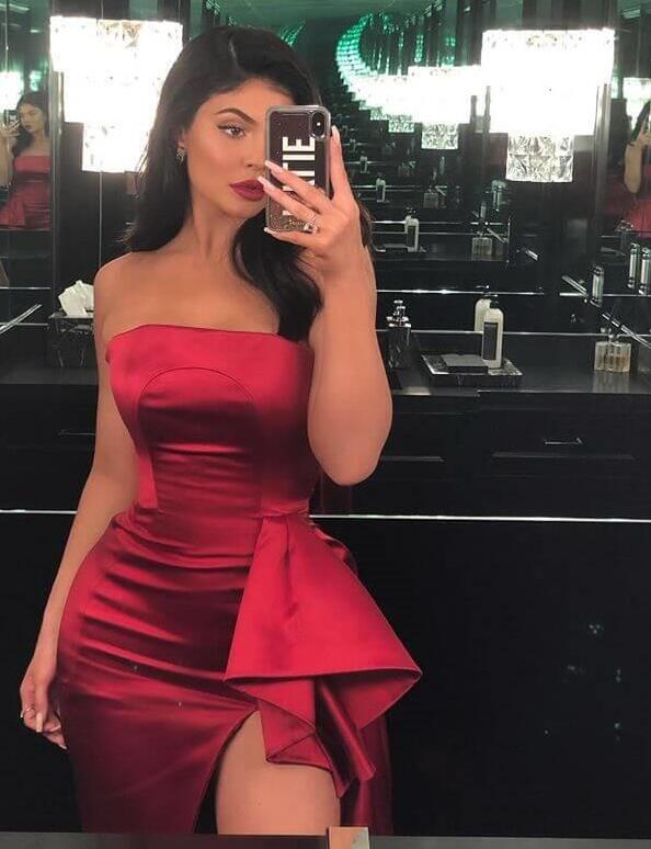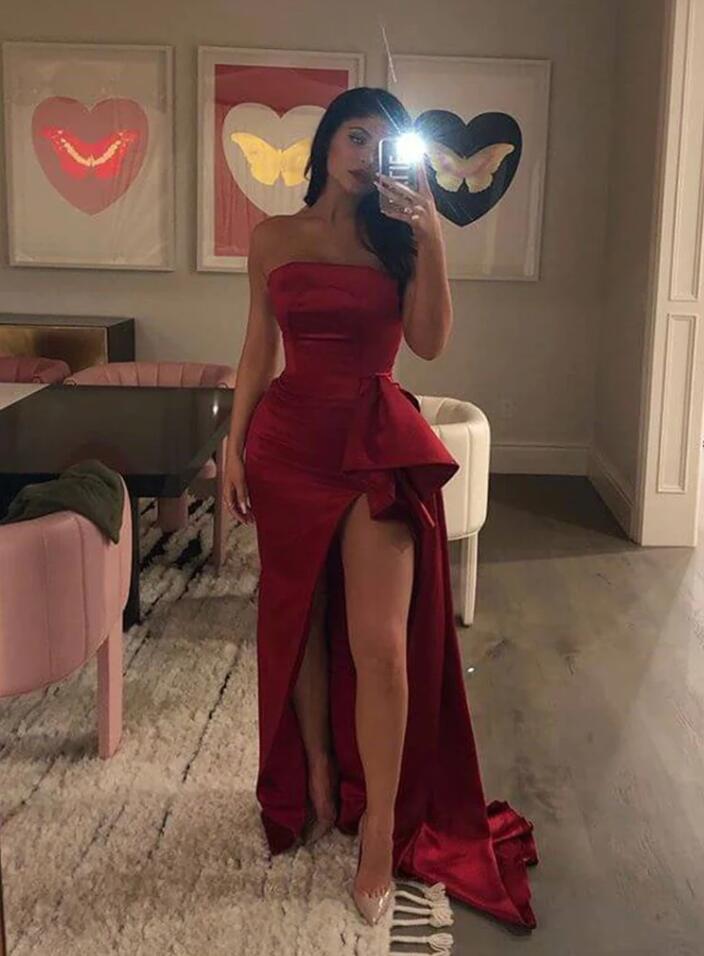 Mermaid Strapless Burgundy Prom Dress with High Slit