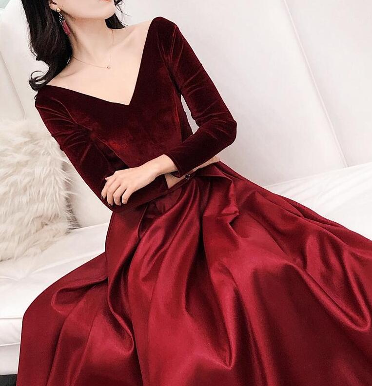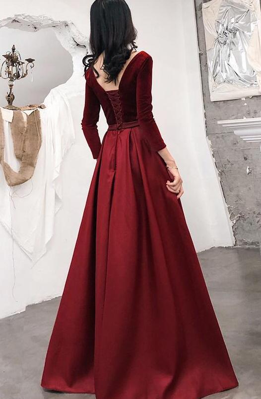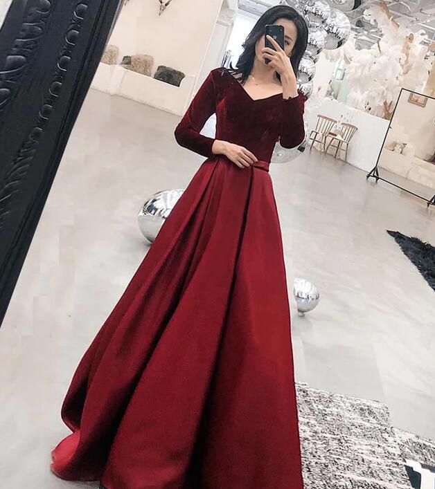 Elegant V-Neck A-Line Prom Dresses With Wine Red Velvet