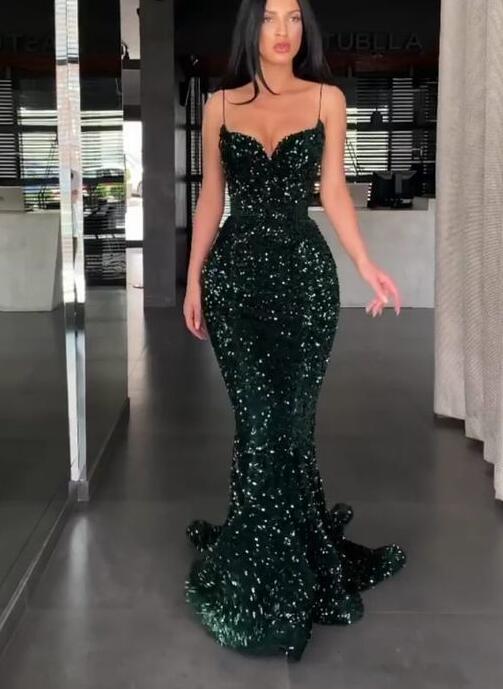 Sparkly Spaghetti Straps Green Sequin Long Evening Dresses