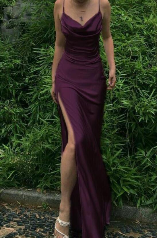 Simple A Line Purple Silk Satin Prom Dress With Split
