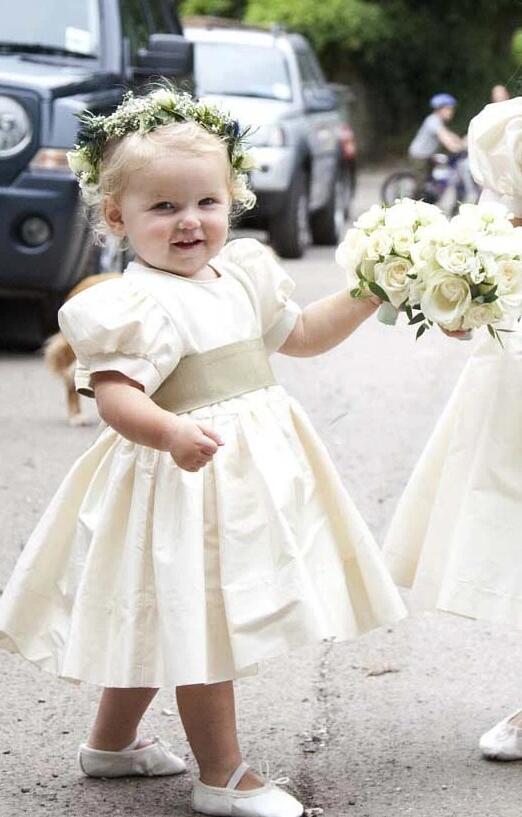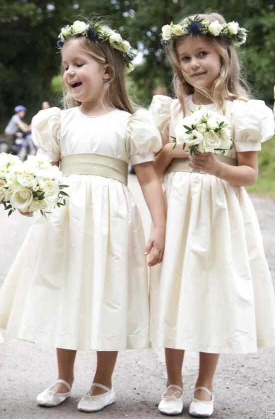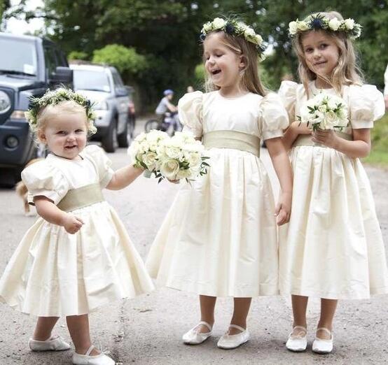 Cute Tea Length Round Neck Satin Flower Girl Dresses