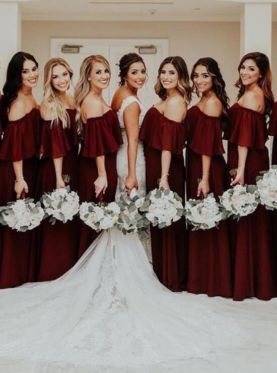 A-Line Off the Shoulder Burgundy Chiffon Long Bridesmaid Dress