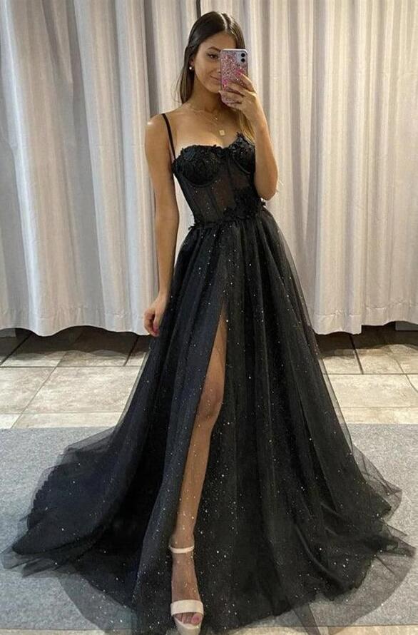 Sexy A-line Black Tulle Long Split Prom Dresses