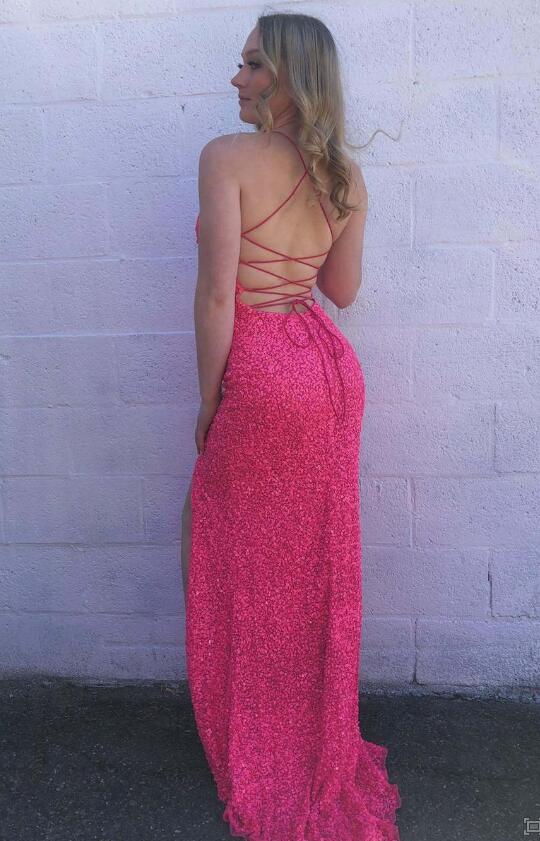 Mermaid Hot Pink Sequins Long Evening Dresses with Slit