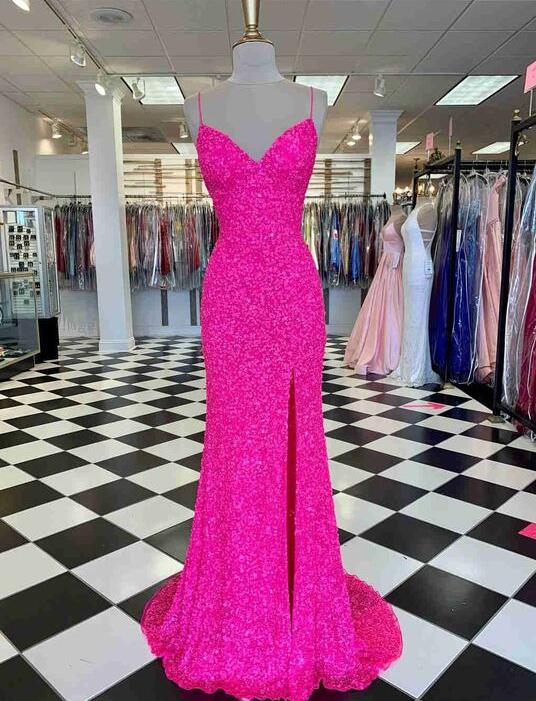 Beautiful Hot Pink Straps Long Prom Dress with Slit