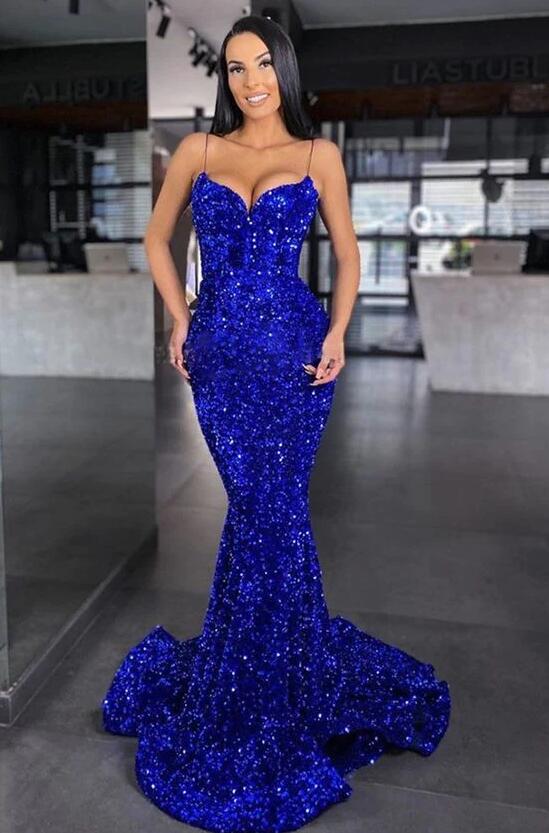 Mermaid Royal Blue Sequins Long Prom Dresses