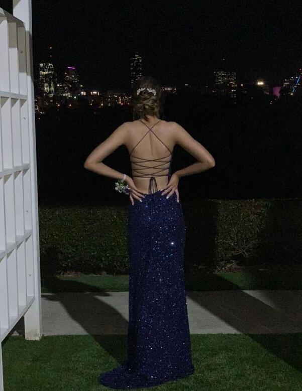 Mermaid Cross Back Navy Blue Sequin Long Prom Dresses