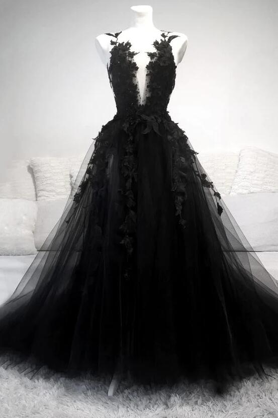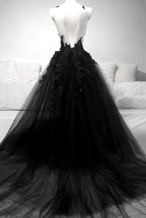 A Line Black V Neck Lace Long Evening Dresses