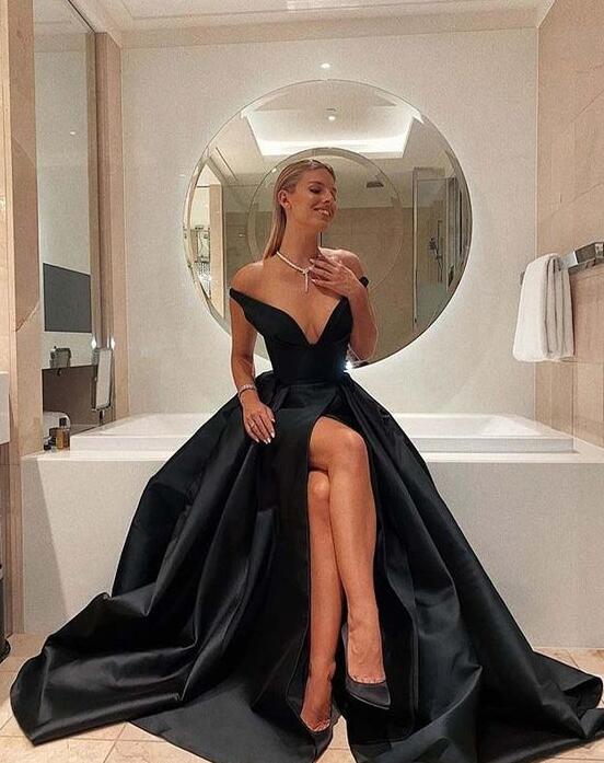 Elegant A-Line Black Long Prom Dresses with Front Slit