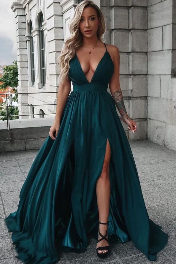 A Line Dark Green Chiffon V Neck Prom Dresses