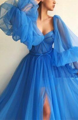 A Line Tulle Blue Long Sleeves Prom Evening Dresses