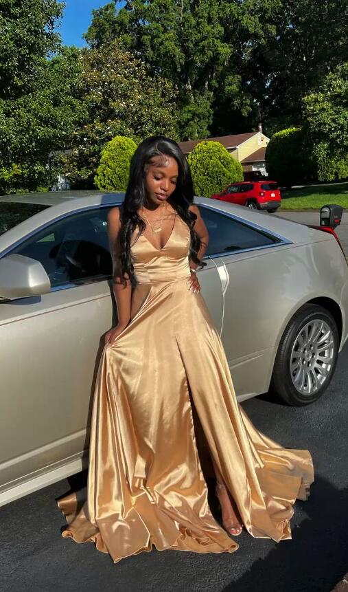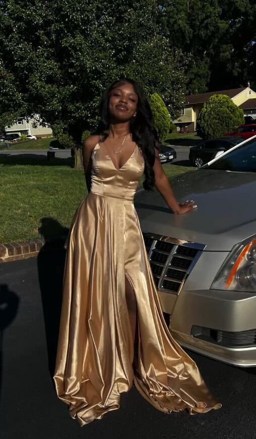 A Line Sleeveless V Neck Gold Satin Long Prom Dress
