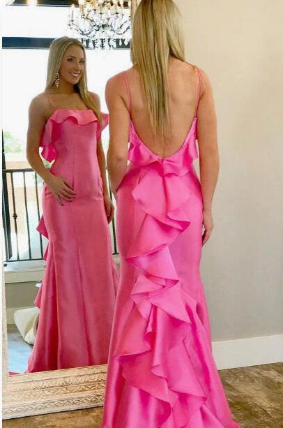 Gorgeous Pink Satin Long Prom Dress With Ruffles