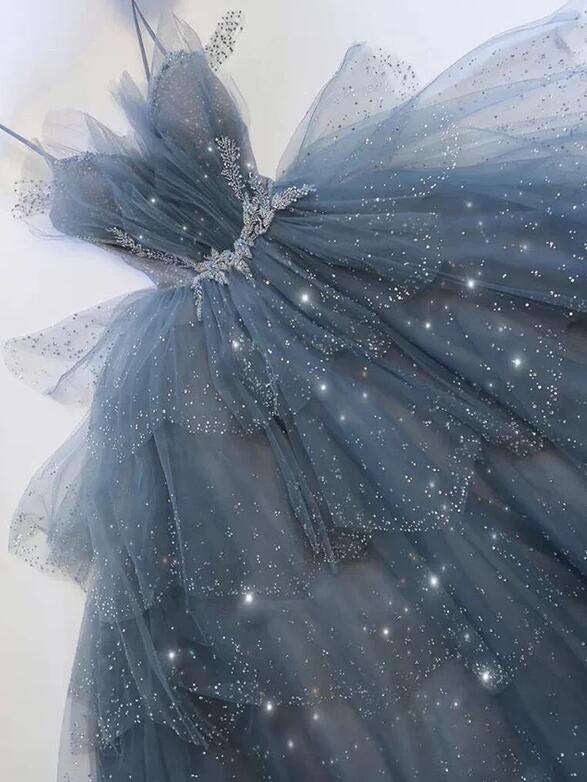 Shiny Spaghetti Straps Tulle A-Line Blue Prom Dresses