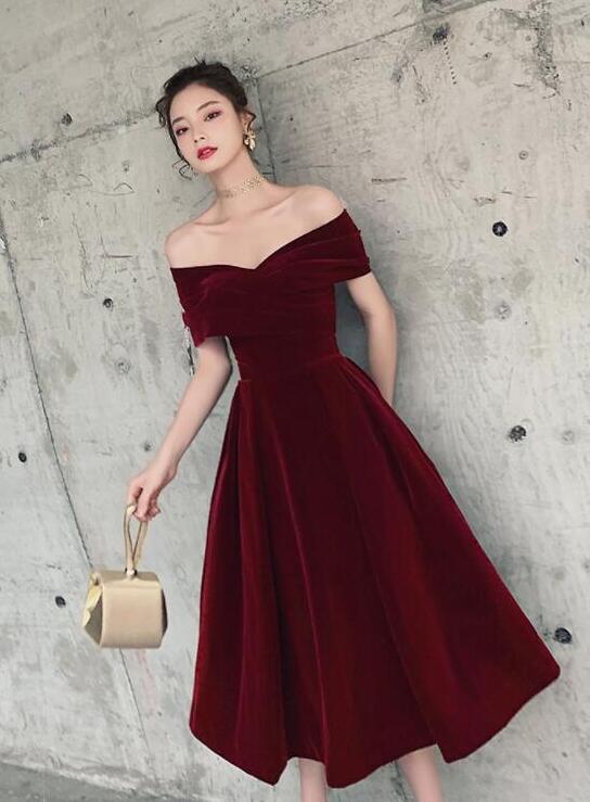 Off Shoulder Tea Length Wine Red Velvet Evening Party Dresses