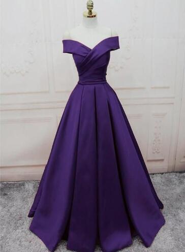Off Shoulder Dark Purple Satin Long Prom Formal Gown