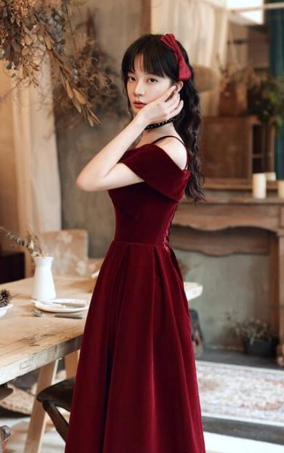 Off Shoulder Wine Red Velvet Long Evening Dress