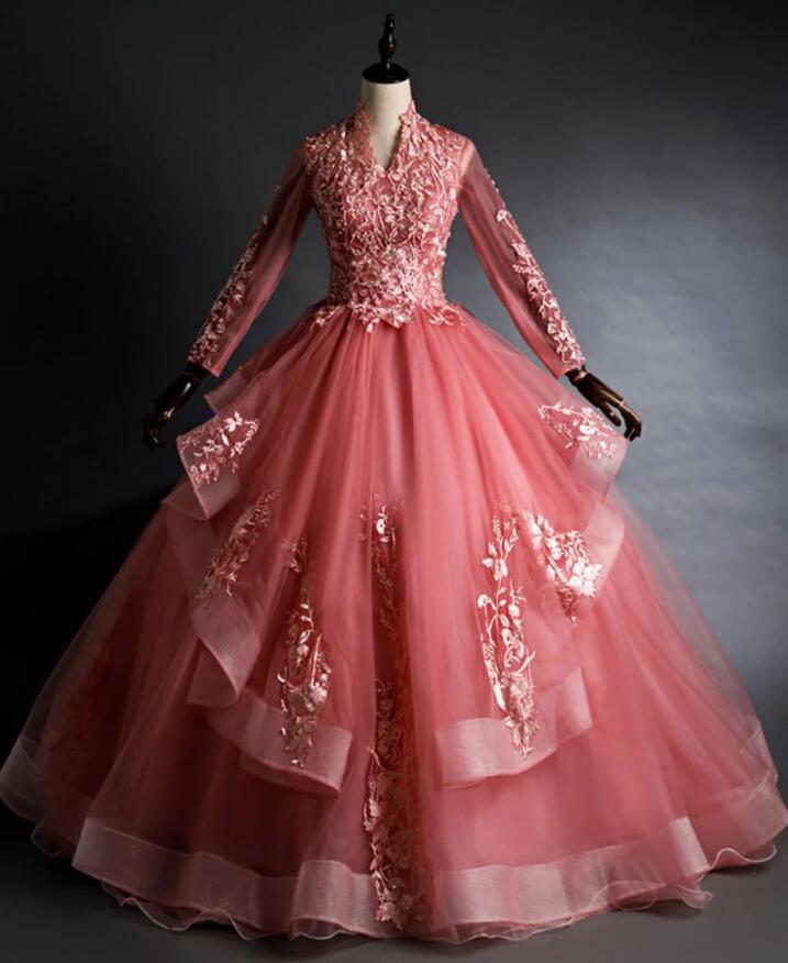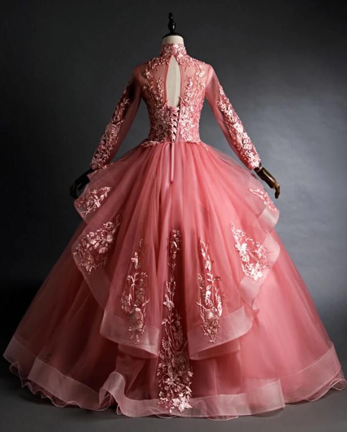 Vintage Pink High Neck Long Sleeves Quinceanera Dresses