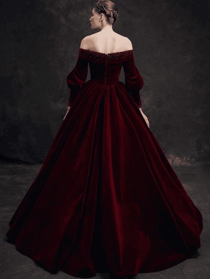 Vintage Wine Red Velvet Long Sleeves Beaded Party Dresses