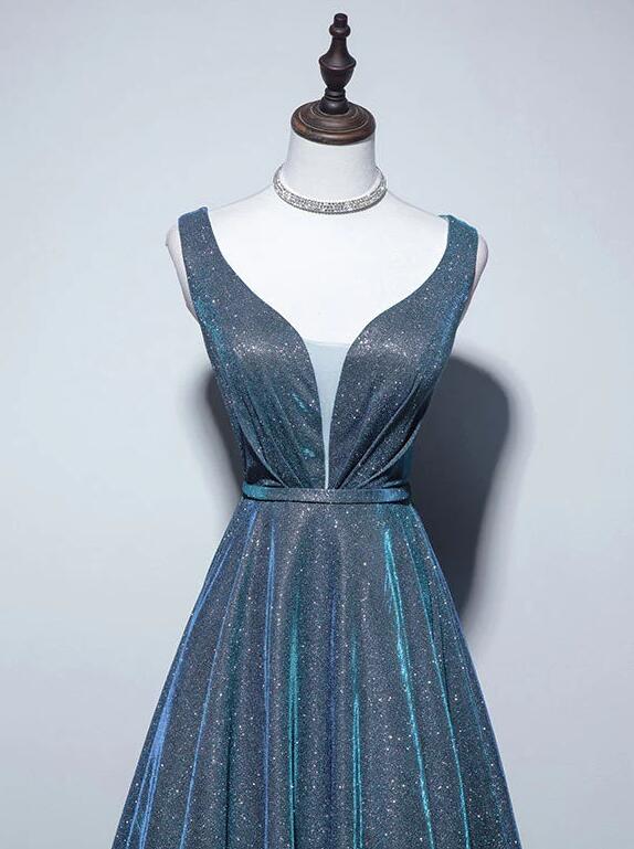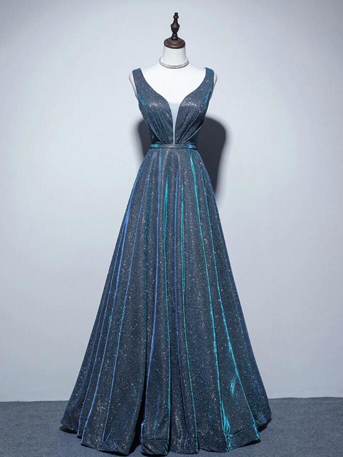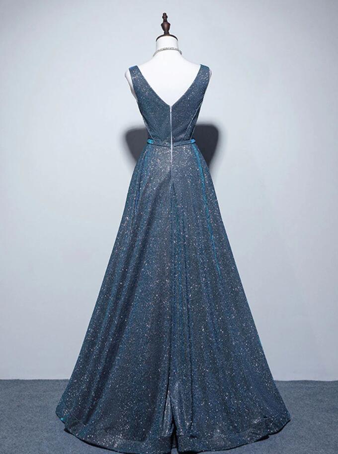 Simple A-Line Blue Sequin Long prom Dresses