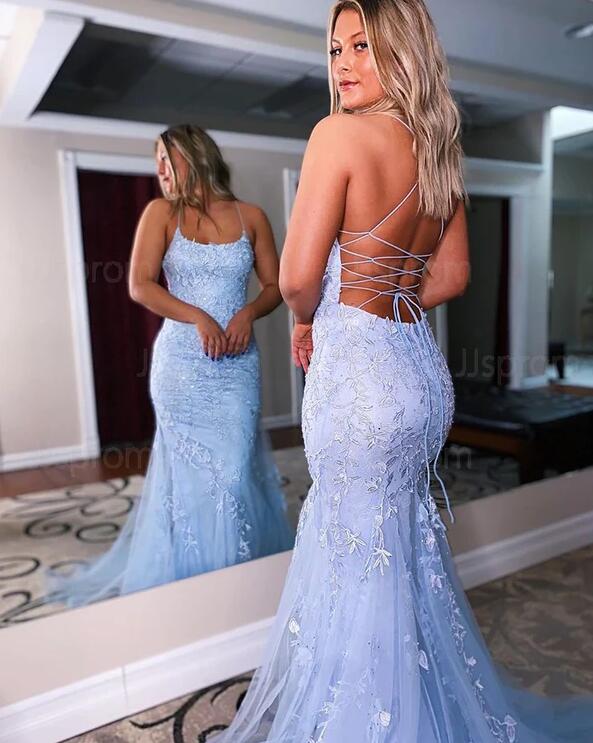 Mermaid spaghetti straps light blue lace prom dress