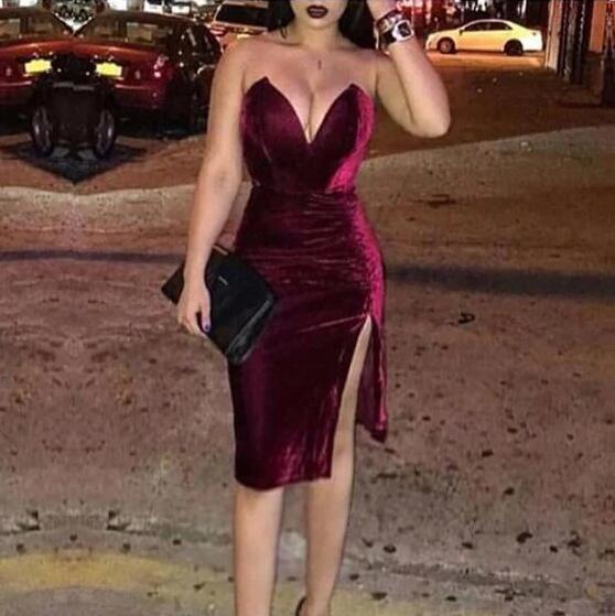 Sexy Deep V Neck Wine Red Velvet Slit Slim Evening Dress