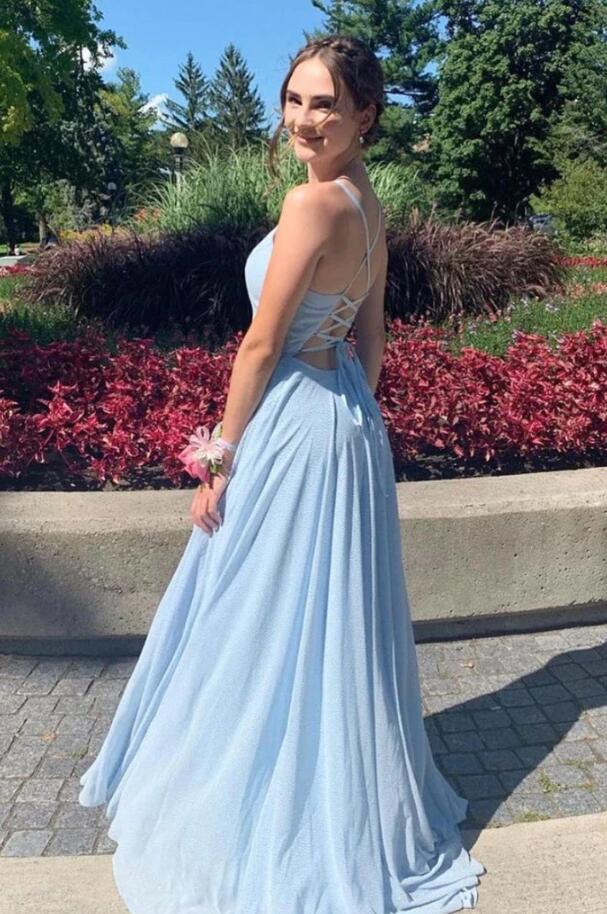 A Line V Neck Blue Long Prom Dresses