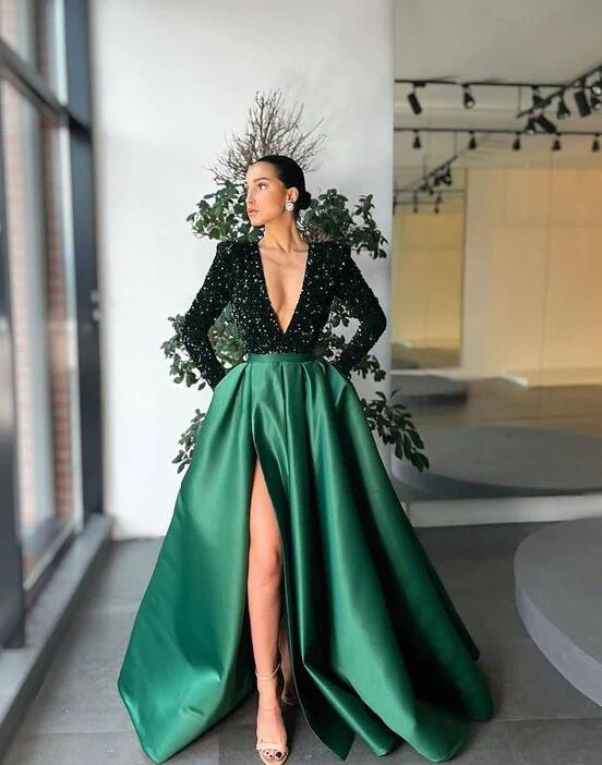 A-Line V-Neck Stain Split Prom Dresses With Sequin