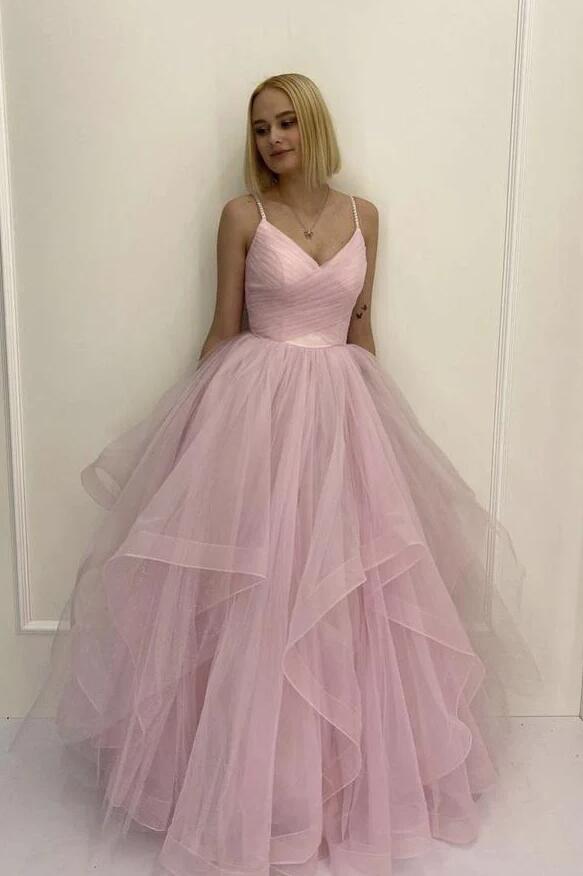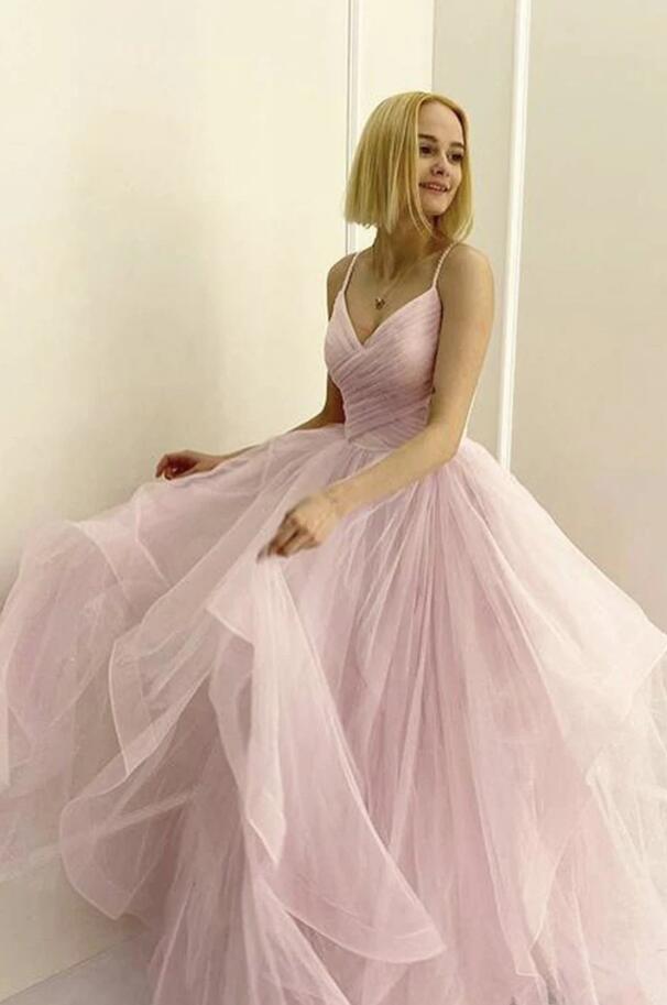 A Line Straps Pink Tulle Prom Dress Evening Dress