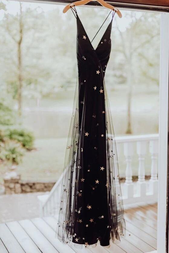 Fashion V Neck Black Tulle Prom Dresses With Gold Star