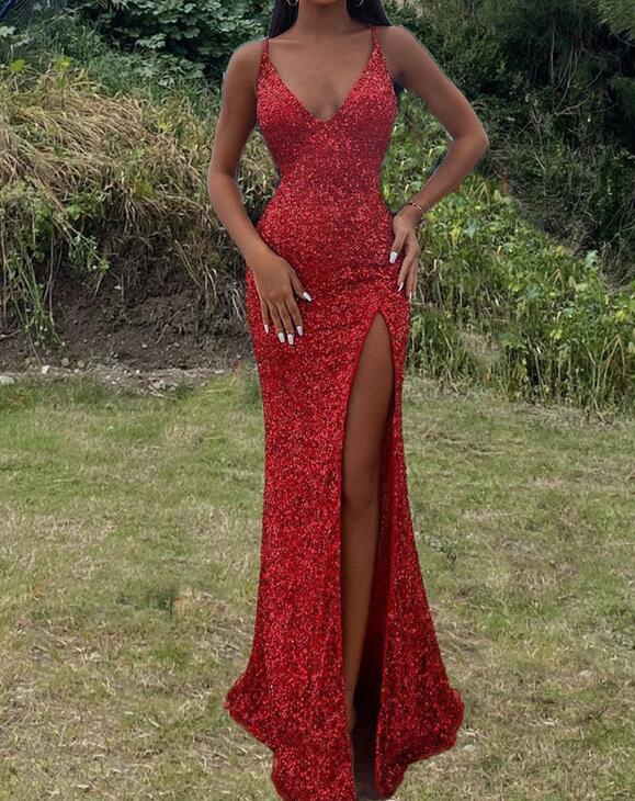 Sexy Mermaid Sequin V Neck Split Evening Dress