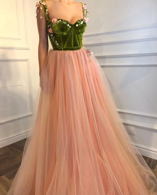 Beautiful light pink spaghetti-straps tulle sleeveless prom dress with green velvet