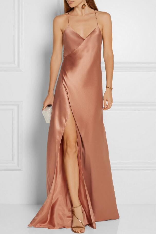 A-Line Spaghetti Straps Champagne Satin Prom Dress with Split