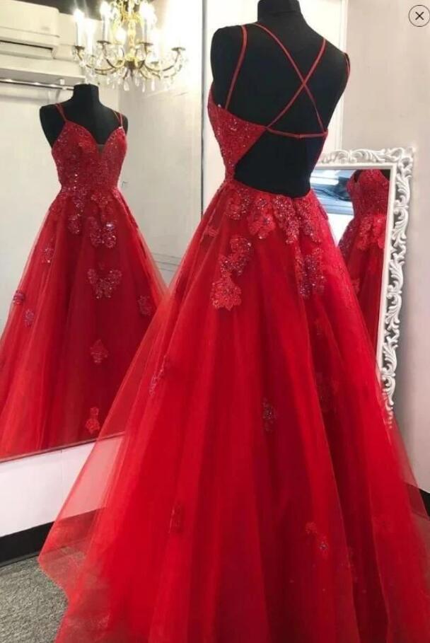 Spaghetti Straps V Neck A Line Lace And Tulle Long Prom Dresses