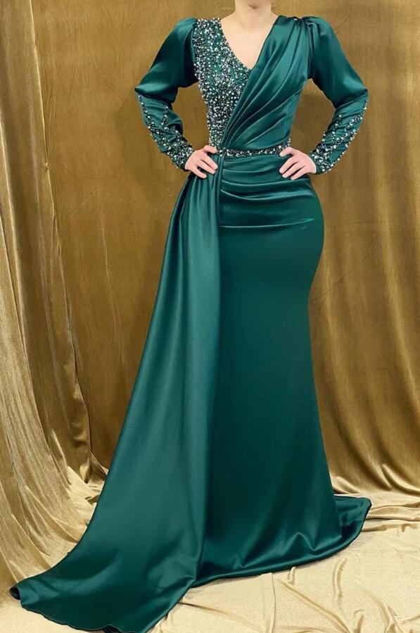 Mermaid Long Satin V-neck Prom Dress With Beading