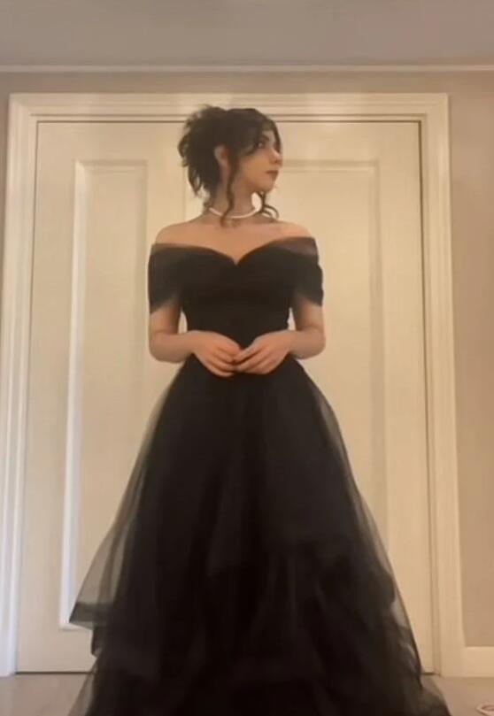 A-Line Black Off Shoulder Tulle Formal Prom Dresses