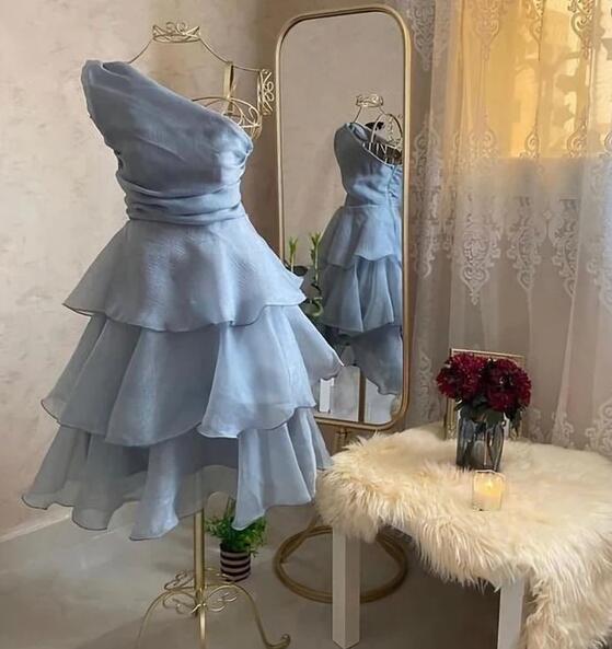 One Shoulder Layered Dusty Blue Chiffon Short Prom Dresses