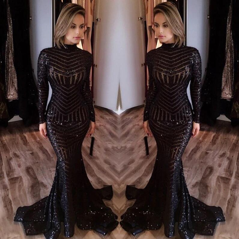 Sexy Mermaid High Neck Black Sequined Prom Dress With Long Sleeves